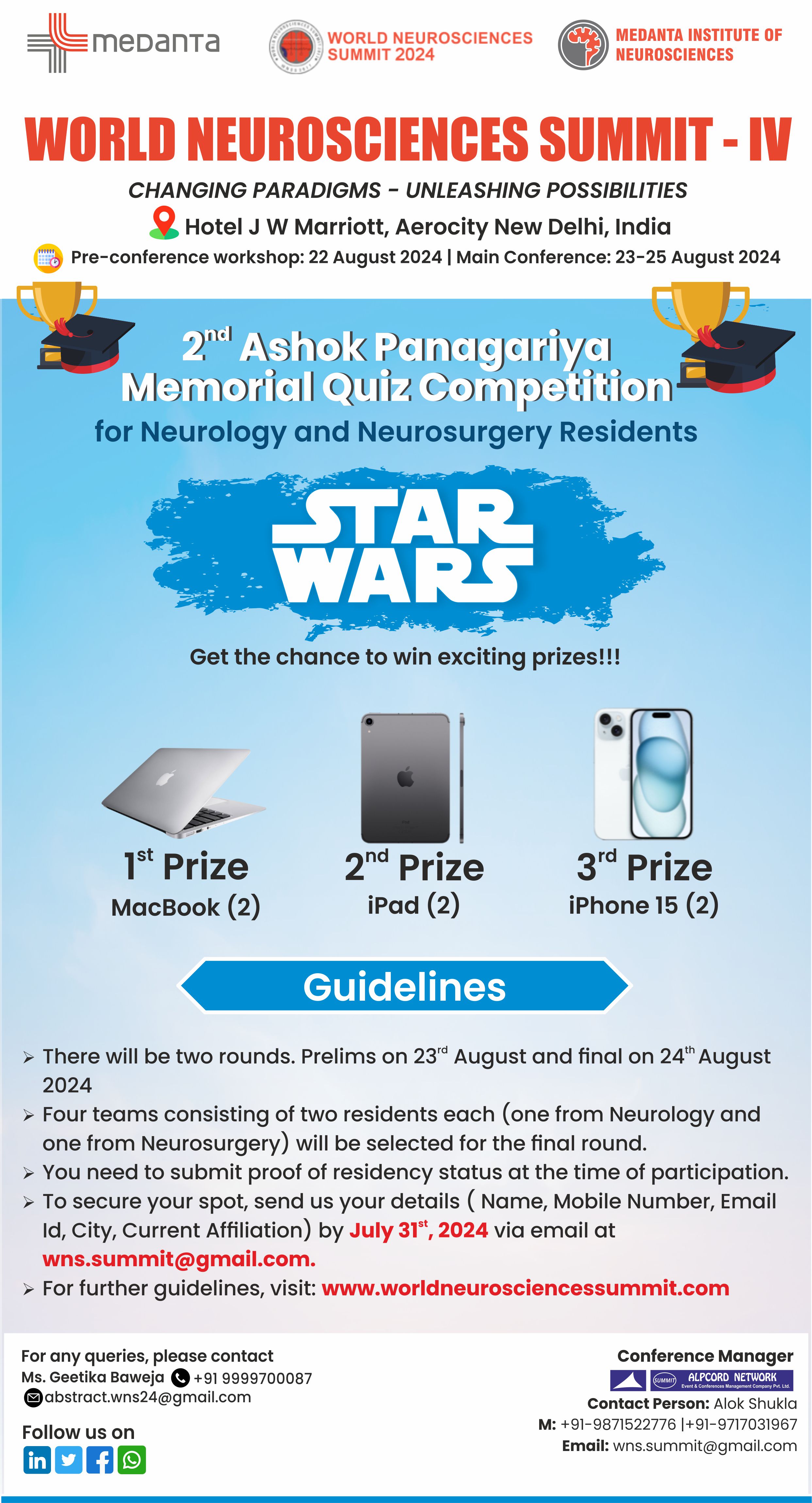 For the Quiz there will be a preliminary round comprising of written multiple choice at 13:30 Hrs - 14:30 Hrs (Lunch time) 23rd August 2024, Friday (Venue- JW Marriott, Aerocity, New Delhi). This competition is essentially for neurology and neurosurgery residents as well as recently qualified neurologists or neurosurgeons. Those who qualified or completed their tenure before 1st January 2024 would not be eligible. Conference registration is mandatory for participation in the quiz. Once registered for the conference, send your team details (mention your registration number) to conference secretariat latest by 1st August 2024.